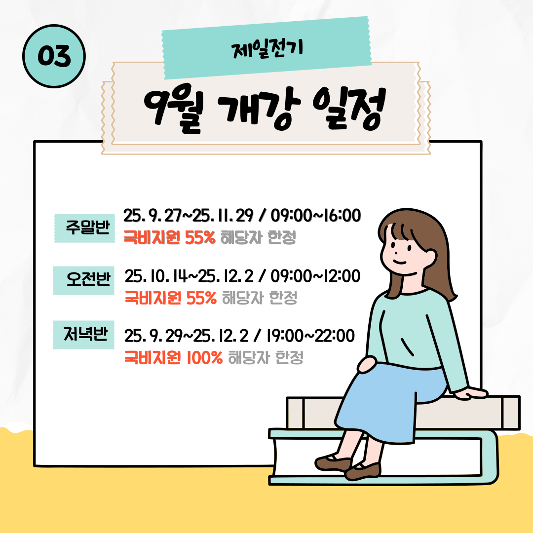 주말반 25. 9. 27 ~ 25. 11. 29 / 09:00 ~ 16:00 (토,일)